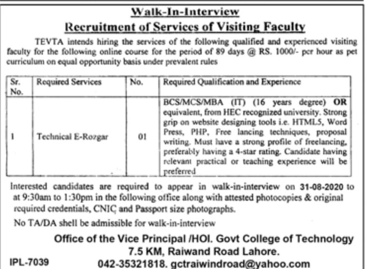 TEVTA has announced the vacant posts for Visiting Faculty Jobs 2020 for the Pakistani nationals. TEVTA is inviting applications from the suitable candidates. In these Latest Technical Education and Vocational Training Authority TEVTA Punjab Jobs the suitable, eligible, candidates from across the area can apply through the proper procedure defined by the Institution and can get these Jobs in Pakistan 2020 after the complete recruitment process.